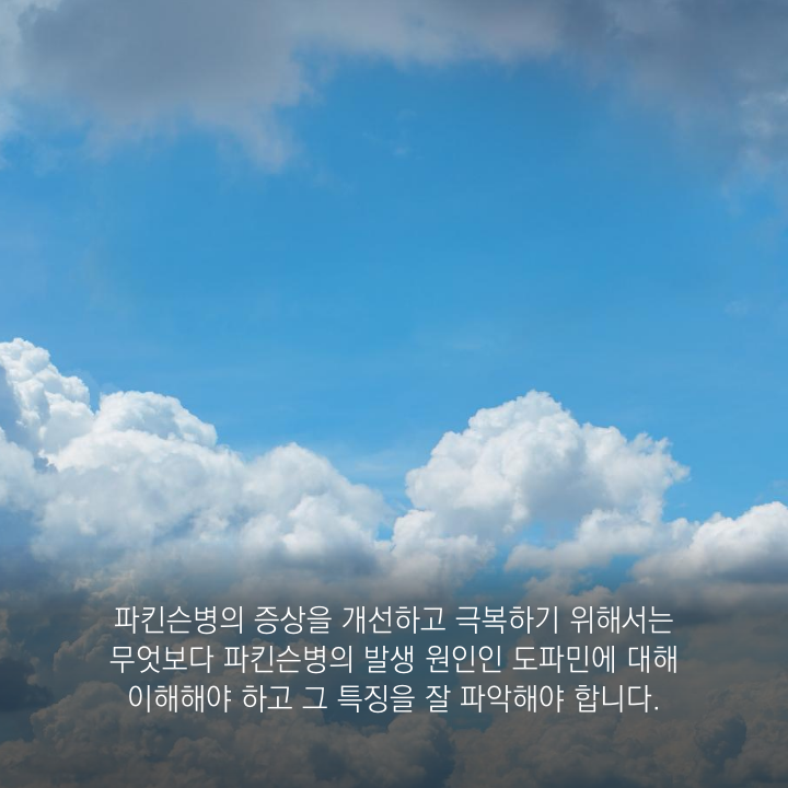 하지만 병이 계속해서 진행될 경우 모든 관절을 약간 굽히고 구부정하게 걷는 파킨슨병의 전형적인 걸음걸이와 인지기능장애, 수면장애, 다한증, 안구건조증 등 다양한 기능 장애가 나타납니다. 파킨슨병의 증상을 개선하고 극복하기 위해서는 무엇보다 파킨슨병의 발생 원인인 도파민에 대해 이해해야 하고 그 특징을 잘 파악해야 합니다. 도파민은 우리의 몸과 마음을 활력 있게 만들어주는 신경전달물질로 활성화하여 잘 분비될 때는 의욕이 넘치고 활력으로 생동감이 넘쳐 매사에 열정적인 사람이 되지만,